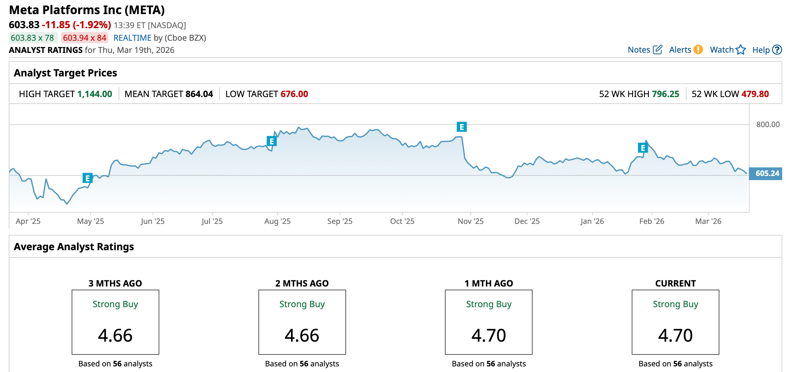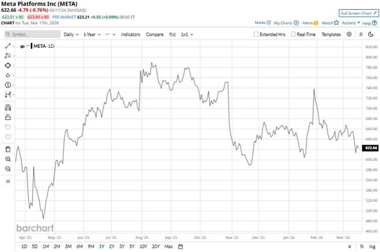 Heavy investments in AI infrastructure have affected Meta’s stock lately. Over the past 52 weeks, the stock has gained a modest 3.92%. However, over the past six months, it has dropped 22%, while it is down 8.1% year-to-date (YTD). The stock reached a 52-week high of $796.25 back in August 2025, but is down 24% from that level.