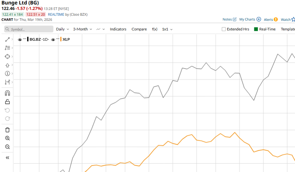 Shares of the agribusiness giant have pulled back 4.7% from its 52-week high of $128.46, recorded on Mar. 17. Shares of Bunge have soared 33.4% over the past three months, surpassing the State Street Consumer Staples Select Sector SPDR ETF’s (XLP) 4% rise over the same time frame.