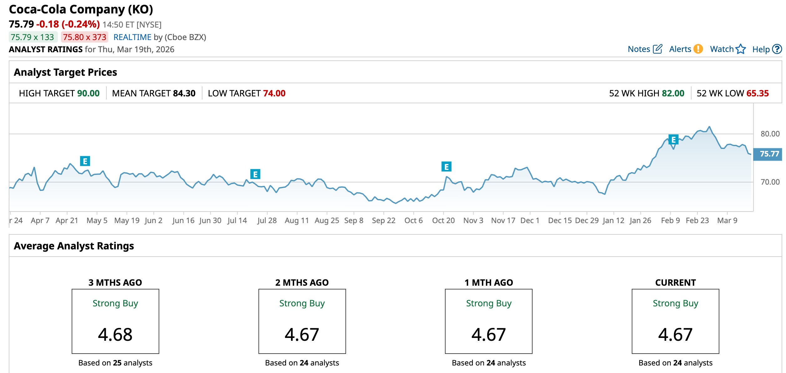 The beverage giant’s steady business strength is clearly reflected on the charts as well. KO stock has gained over 9.49% over the past 52 weeks, with 14.19% surge over just the last six months. Also, 2026 has started on a strong note, with shares rising 8.5% year-to-date (YTD), printing fresh highs 22 times this year, and even touching a high of $82 in February.
