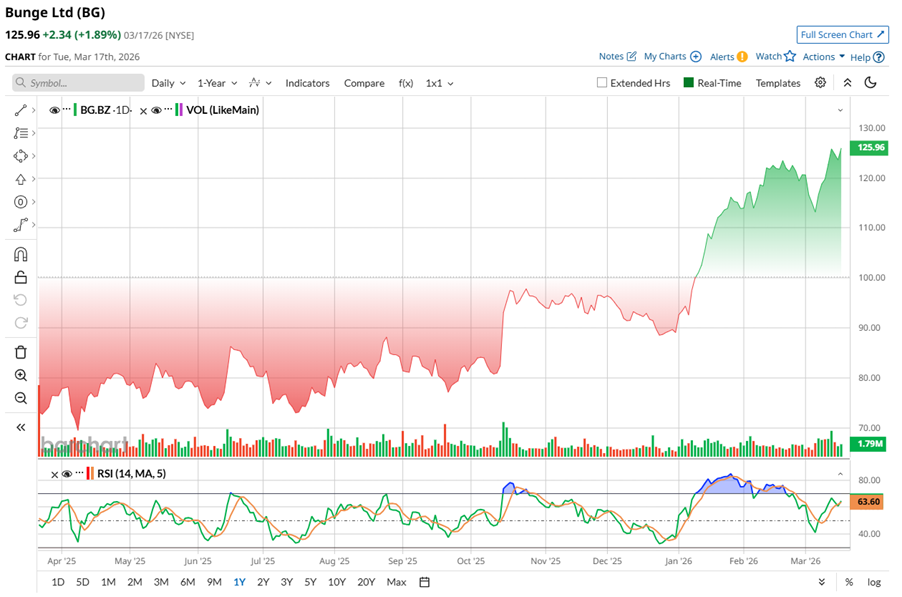 Shares of the agribusiness and food company have been on a strong run, with its stock recently touching a long-term high of $128.46 before easing slightly. Over the past year, shares have surged nearly 62.7%, comfortably outperforming not just the State Street Consumer Staples Select Sector SPDR ETF’s (XLP) 2.87% surge, but also the S&P 500 Index’s ($SPX), which gained around 15.8%.