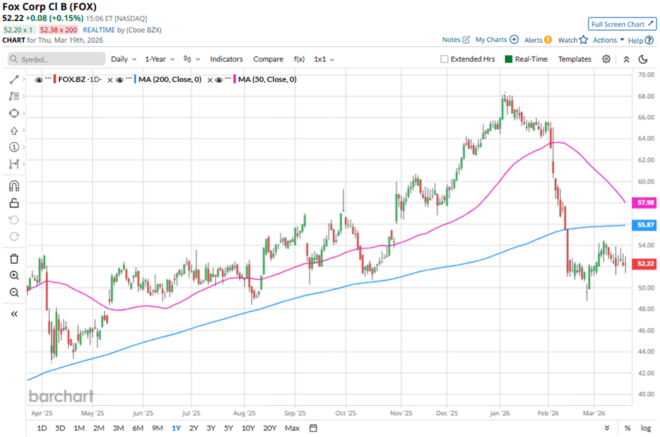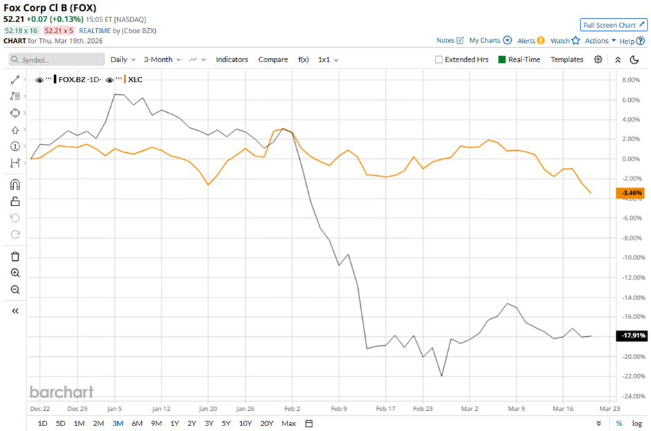 Shares of the New York-based company have fallen 24.1% from its 52-week high of $68.18. Fox Corporation shares have declined 18.6% over the past three months, underperforming the State Street Communication Services Select Sector SPDR ETF's (XLC) 3.4% dip during the same period.