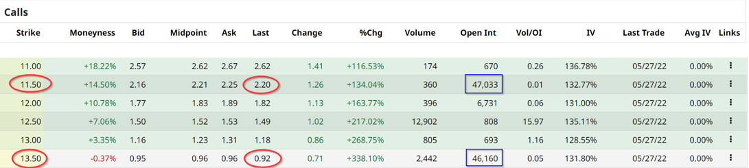 This shows that the $11.50 calls (strike price) are worth $2.20, or $220 per call contract. The $13.50 calls are worth $92 per call.