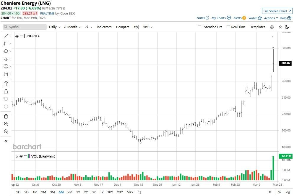 Cheniere Energy (LNG) stock pushed meaningfully higher, hitting an all-time high of nearly $297 today following a missile attack on Qatar’s Ras Laffan industrial complex.
