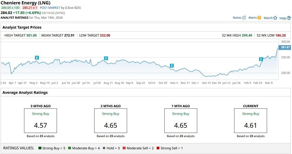 According to Barchart, the consensus rating on Cheniere Energy sits at “Strong Buy,” with price targets as high as $301, indicating potential upside of another 8% from current levels.