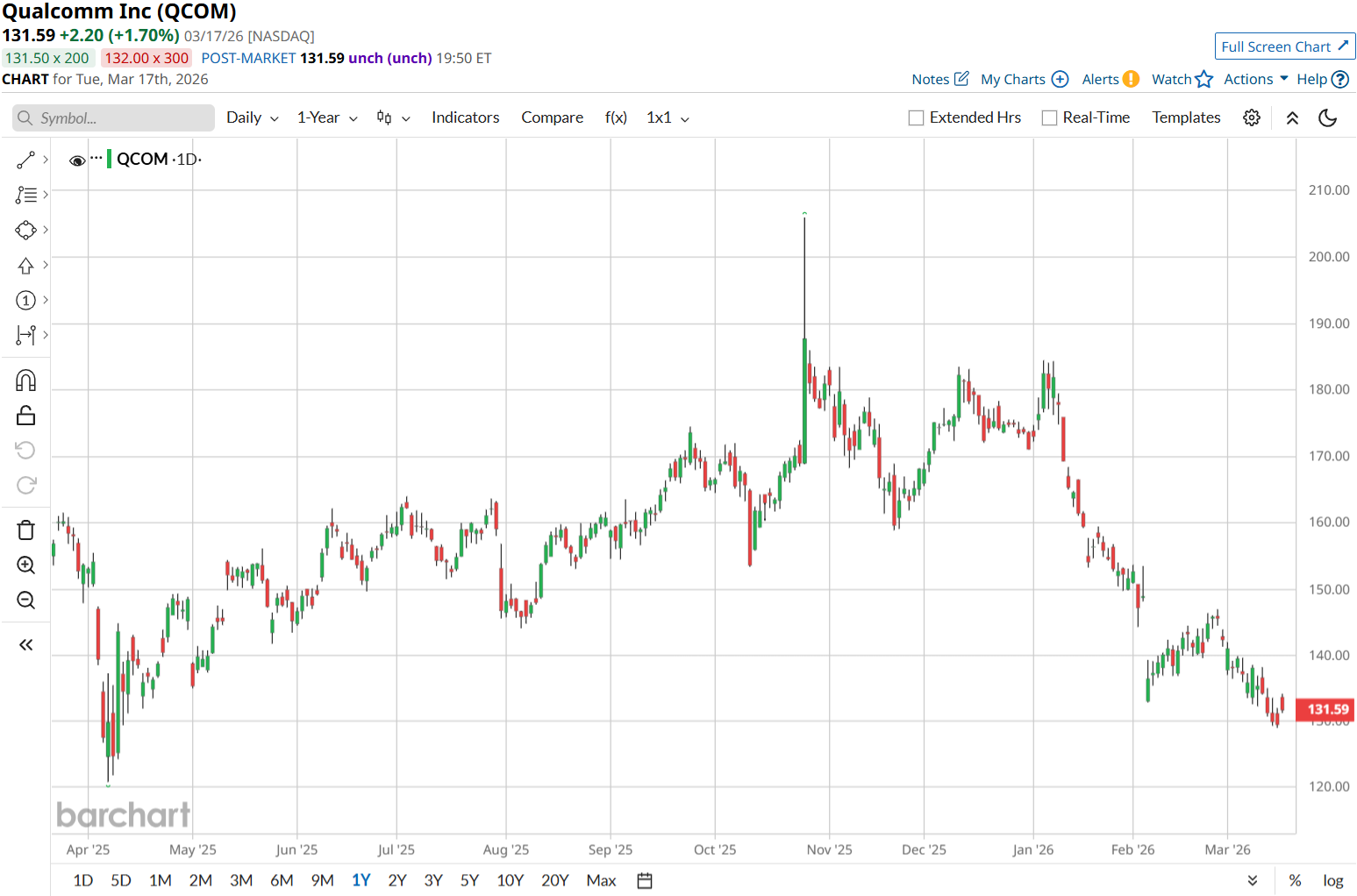 Over the past 52 weeks, that story has not impressed the market, with QCOM shares down about 17%, and YTD they are off another 23%.