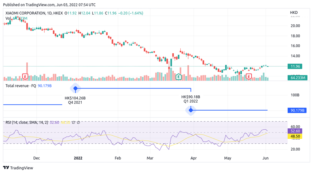 Xiaomi is currently trading sideways on the technicals. From looking at the release of its earnings over the last couple of quarters, it's also clear that the company's price is more affected by the macro-environment than what is released in its earnings reports. The stock's price remained trading in a sideways manner in Q4 2021 despite increasing its revenues, and in Q1 there was a brief sell-off before continuing the horizontal price movement. As the company heads into the rest of this year it's likely to face increased headwinds from supply chain shortages and the ongoing uncertainties of the coronavirus pandemic which will keep downwards price pressure on the stock.