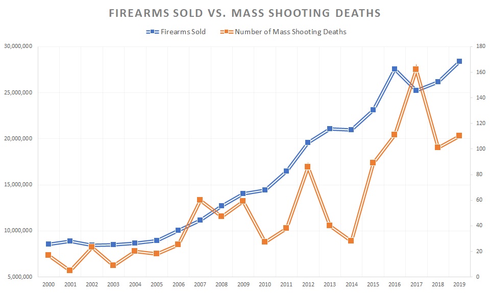 As it turns out, a strong correlation exists between annual firearms purchases and the total number of fatalities from mass shootings every year.