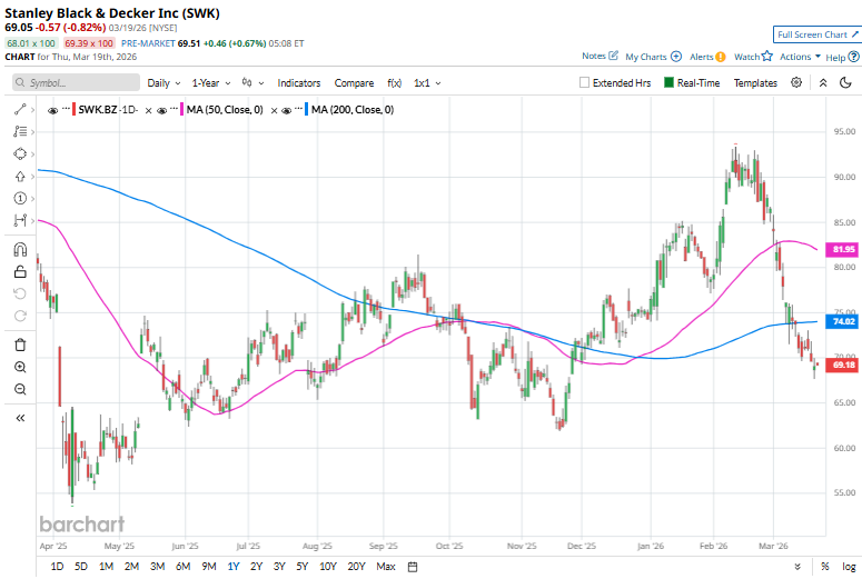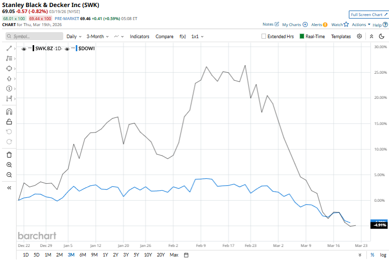Despite its notable strength, SWK slipped 16.9% from its 52-week high of $93.37, achieved on Feb. 11. Over the past three months, SWK stock has declined 5.1%, compared to the Dow Jones Industrial Average’s ($DOWI) 4.4% decline during the same time frame.