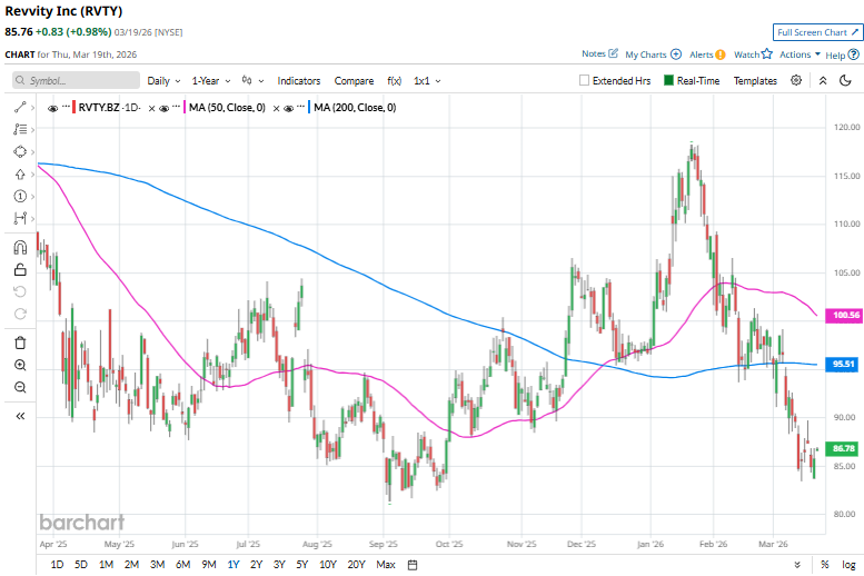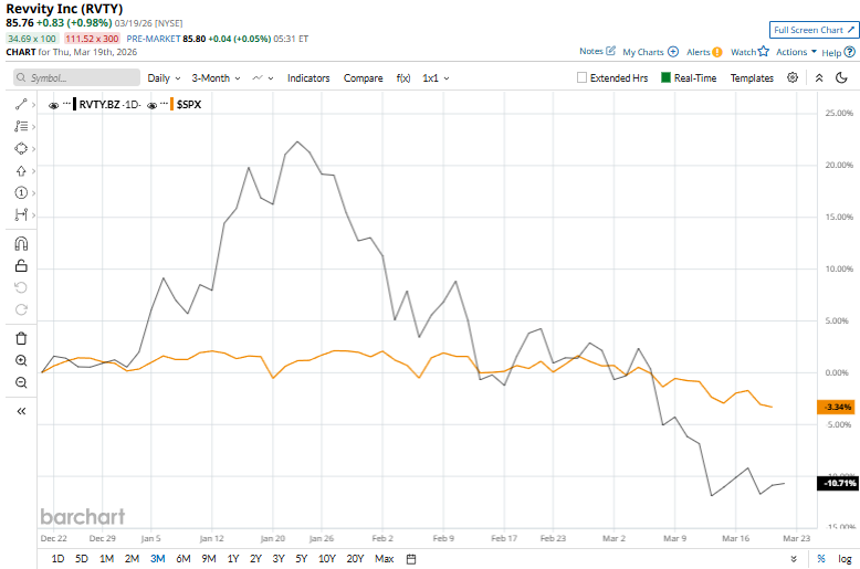 Despite its notable strength, RVTY slipped 27.5% from its 52-week high of $118.30, achieved on Jan. 22. Over the past three months, RVTY stock has gained 10.9%, underperforming the S&P 500 Index’s ($SPX) 3.3% fall.