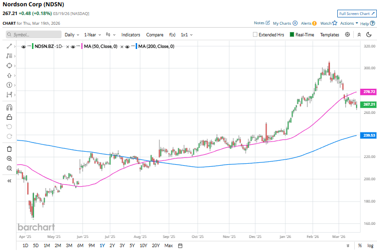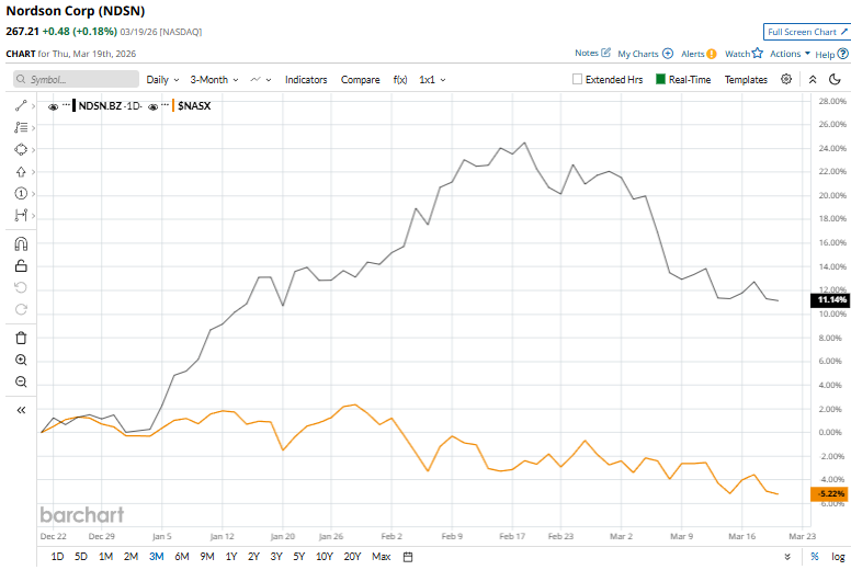 Despite its notable strength, NDSN shares have slipped 12.5% from their 52-week high of $305.28, achieved on Dec. 11. Over the past three months, NDSN stock has gained 11.2%, outperforming the broader Nasdaq Composite’s ($NASX) fall of 5.2% over the same time frame.