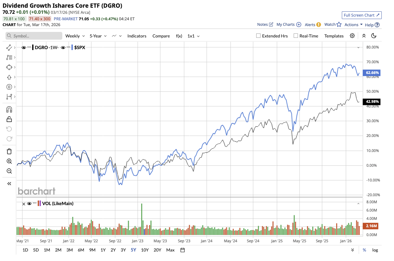 The iShares Core Dividend Growth ETF (DGRO) tracks the Morningstar U.S. Dividend Growth Index. DGRO takes a slightly different approach, focusing on companies that consistently grow their dividends over time.
