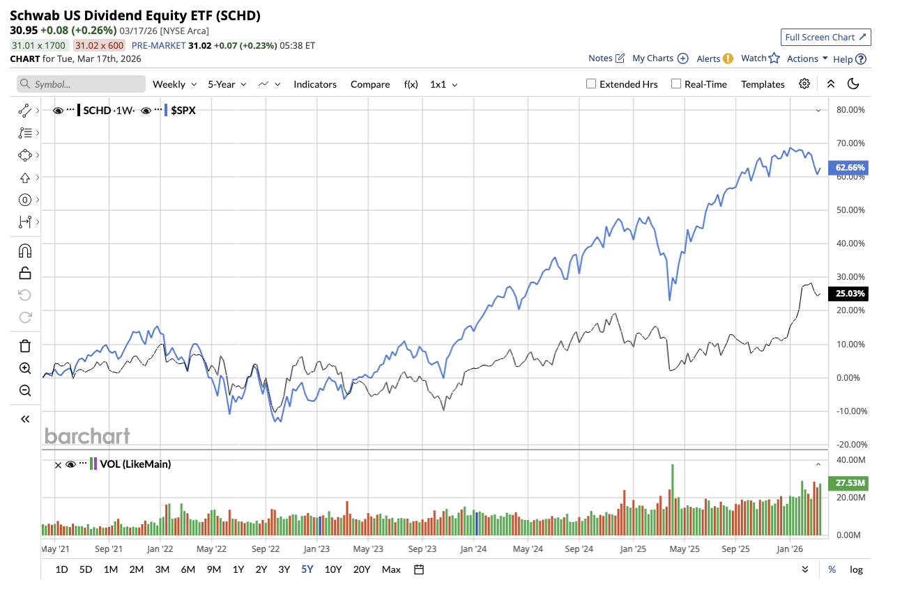 The SCHD currently yields 3.4%, or $1.04 per share annually. It pays more than the S&P 500 Index ($SPX) average of 1.16%, making it one of the best choices for income-focused investors. But what truly sets SCHD apart is its emphasis on financial strength and shareholder returns, rather than just chasing the highest yield. Its portfolio leans toward defensive sectors like energy, consumer staples, and healthcare, which usually tend to fare better during market downturns.