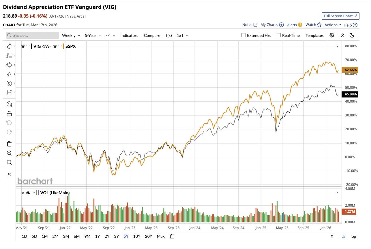 The VIG currently yields 1.6%, or $3.55 per share annually, which is nearly the same as the S&P 500. While its yield is lower than SCHD and DGRO, VIG compensates with stronger capital appreciation potential. It allows investors to participate in market upside while still maintaining a dividend-focused strategy.