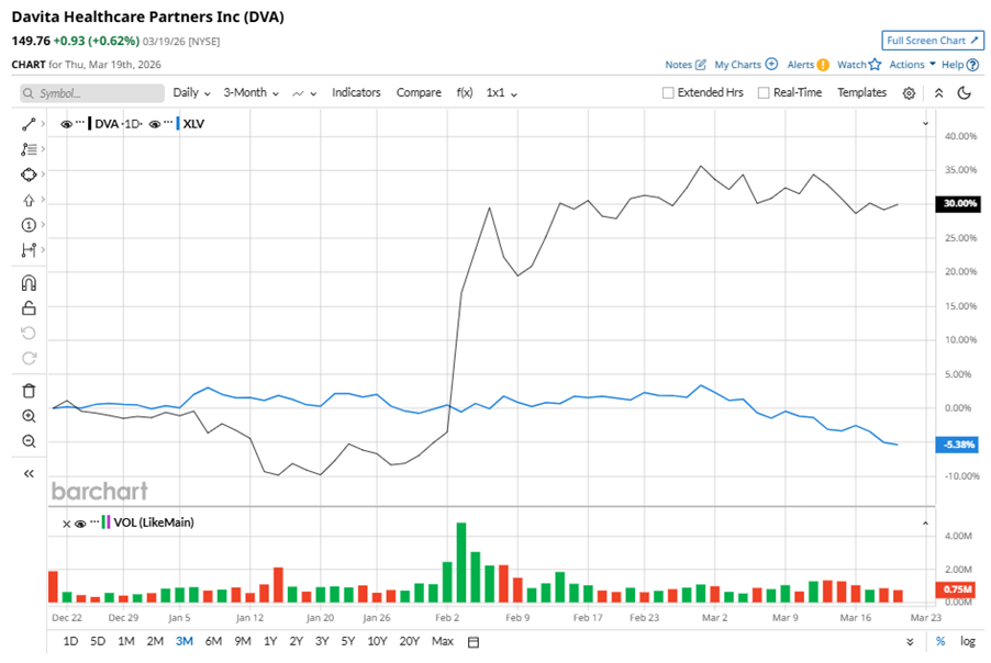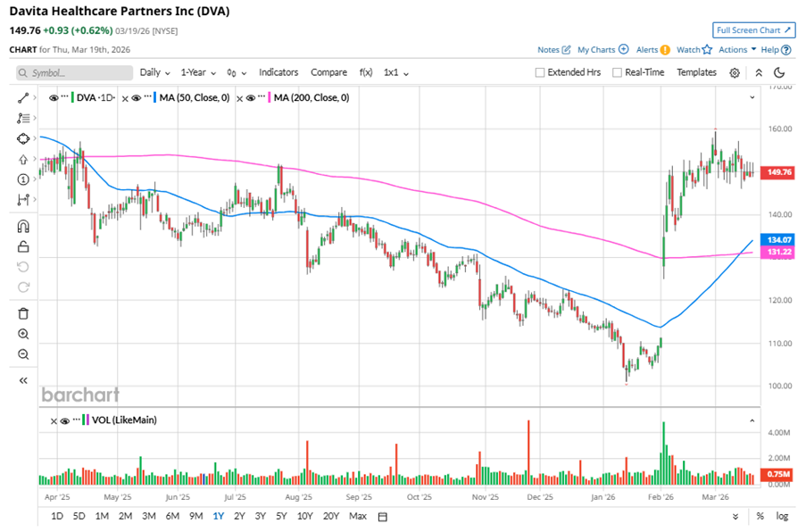 Despite its notable strength, DVA slipped 6.1% from its 52-week high of $159.42, achieved on Mar. 2. Over the past three months, DVA stock has gained 30%, outperforming the State Street Health Care Select Sector SPDR ETF’s (XLV) 5.4% decline during the same time frame.