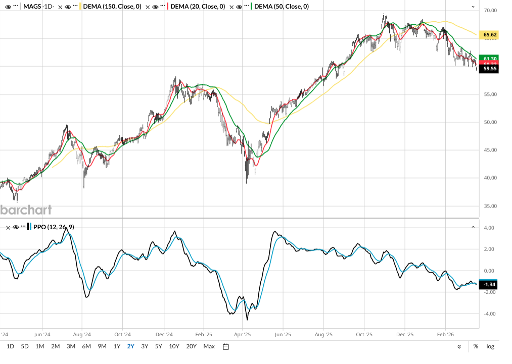 The concern from here is that high-growth-multiple tech leadership is reversing. Here’s the Roundhill Magnificent Seven ETF (MAGS), which is slipping off its former highs like an escalator. But there’s not much around to pick up the slack. Here and there, for days at a time maybe. But nothing that sticks. That smells like a bear to me.