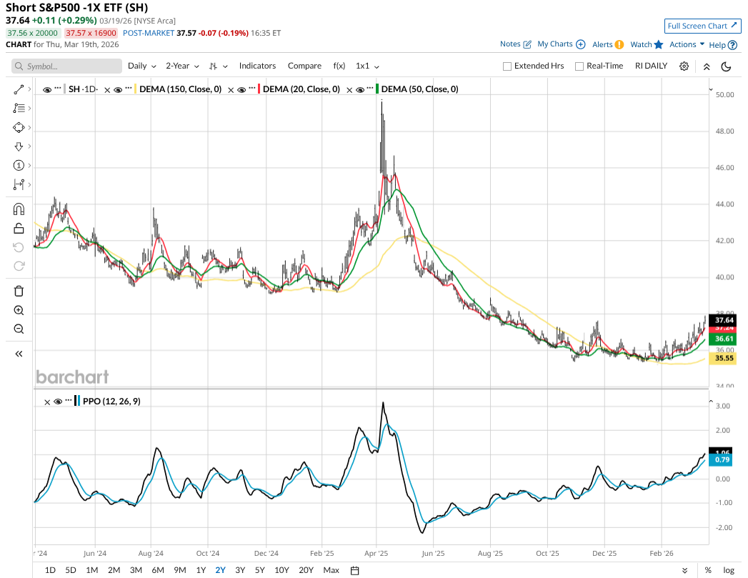 That’s why this chart below looks so good. It is the ProShares Short S&P 500 ETF (SH), which shorts the S&P 500. It’s the first place I look to hedge my stock exposure, when options are not the play. With volatility elevated, that limits some of my options work. So inverse ETFs like this one become a more important section of the wide toolbox I use to try to profit from down stock markets. Yes, you can actually do that!