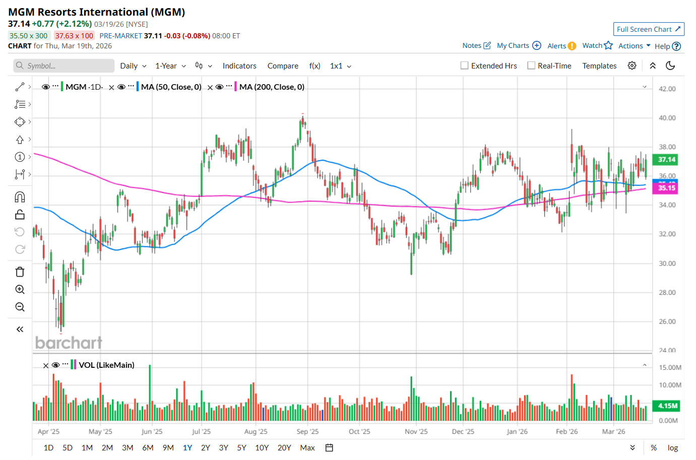 This resorts and casinos company is currently trading 7.5% below its 52-week high of $40.16, reached on Aug. 28, 2025. Shares of MGM have declined marginally over the past three months, outperforming the VanEck Gaming ETF’s (BJK) 16.5% drop during the same time frame.