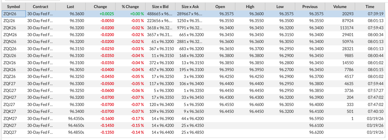 - The deferred futures contracts (ZQJ26) collapsed, dropping below the high end of the ongoing Fed fund range between 96.5 and 96.25 (3.5% and 3.75% Fed fund rate).
