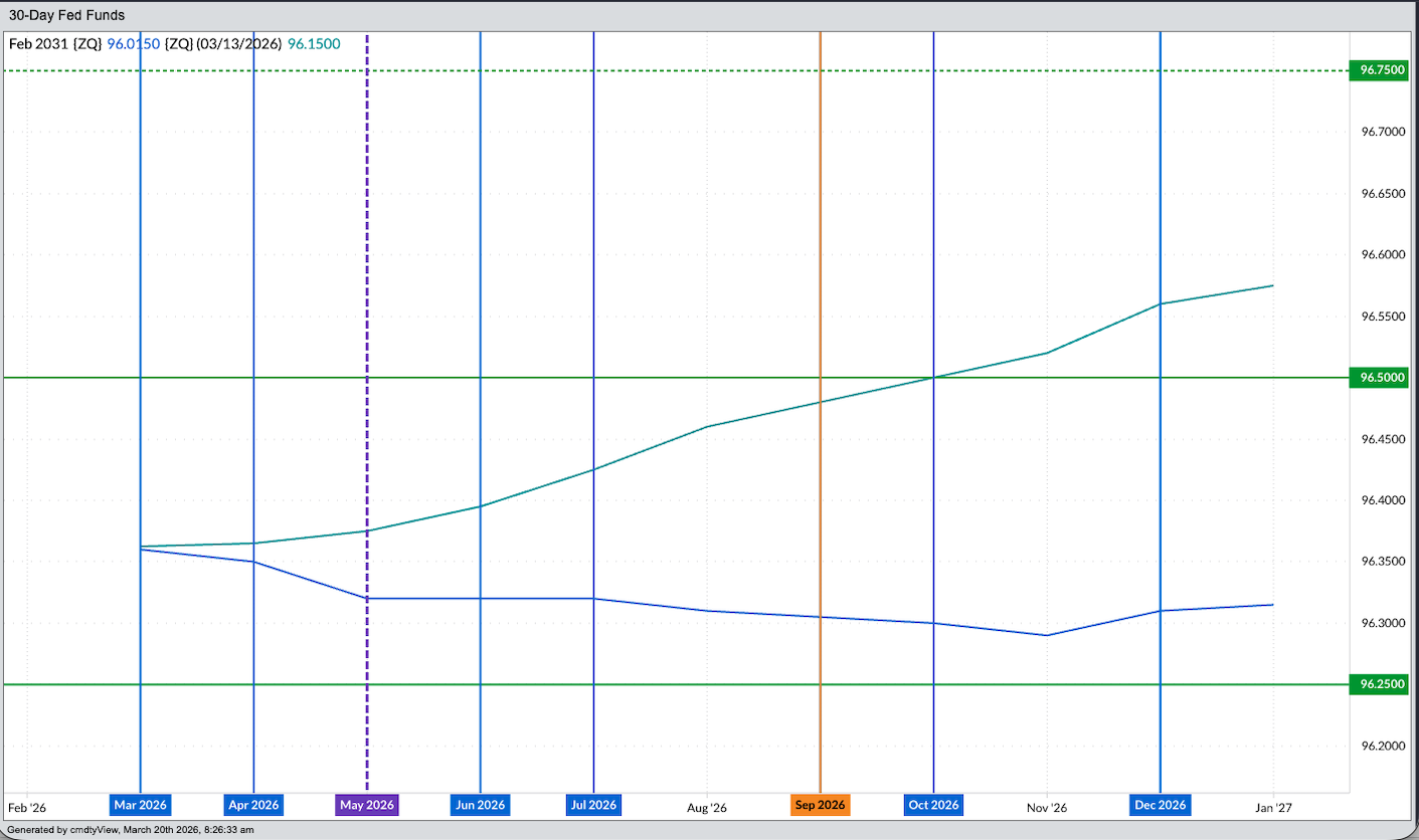 - A look at the Fed fund futures forward curve early Wednesday morning shows futures contracts are pricing in a Fed fund range between 3.5% and 3.75% through the September 2026 issue. There we see the price sitting on 96.5, meaning the outcome of that meeting is a 50-50 chance for the next rate cut. However, as markets get rolling Wednesday, I’m expecting the September contract to dip back below 96.5, keeping the next cut projected for October.