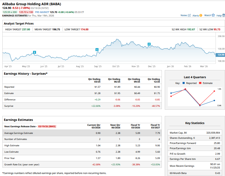 Alibaba (BABA) released its earnings for the fiscal Q3 2026 yesterday, March 19, before U.S. markets opened. The results fell short of expectations, and the company missed on both the top line and the bottom line. It was incidentally the third consecutive quarter where Alibaba missed estimates, and while the stock had risen after fiscal Q1 2026 earnings on optimism about its artificial intelligence (AI) business, markets seem to have finally had it with the earnings misses.
