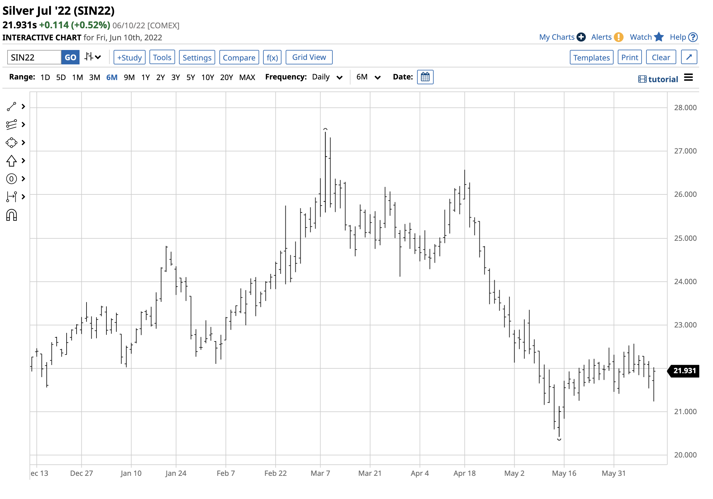 I last wrote about silver on Barchart on May 17, when the July COMEX futures price was $21.73 per ounce. While it was marginally higher at the end of last week, silver is sitting in its dormant stage at just under the $22 level.