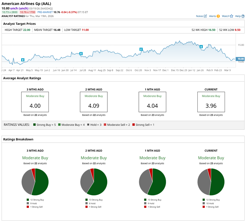 Wall Street maintains a favorable stance on AAL stock, even as near-term uncertainties linger. Among 23 analysts, the consensus rating stands at “Moderate Buy,” out of which 12 recommend a “Strong Buy,” 10 suggest “Hold,” and only one leans toward a “Strong Sell.”