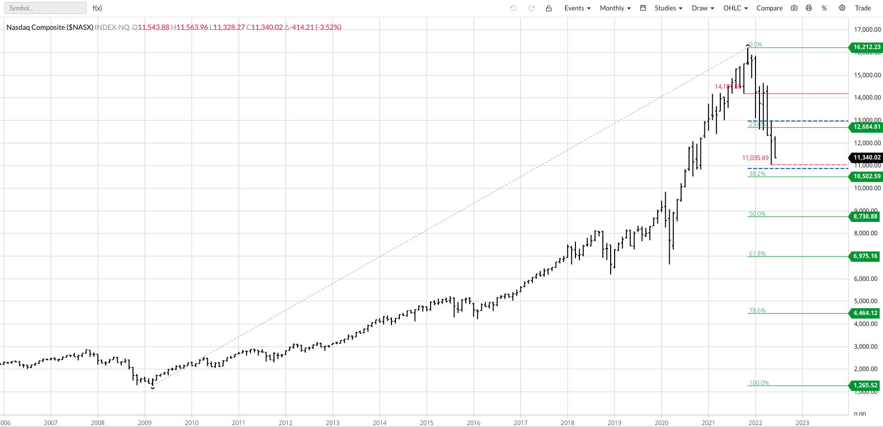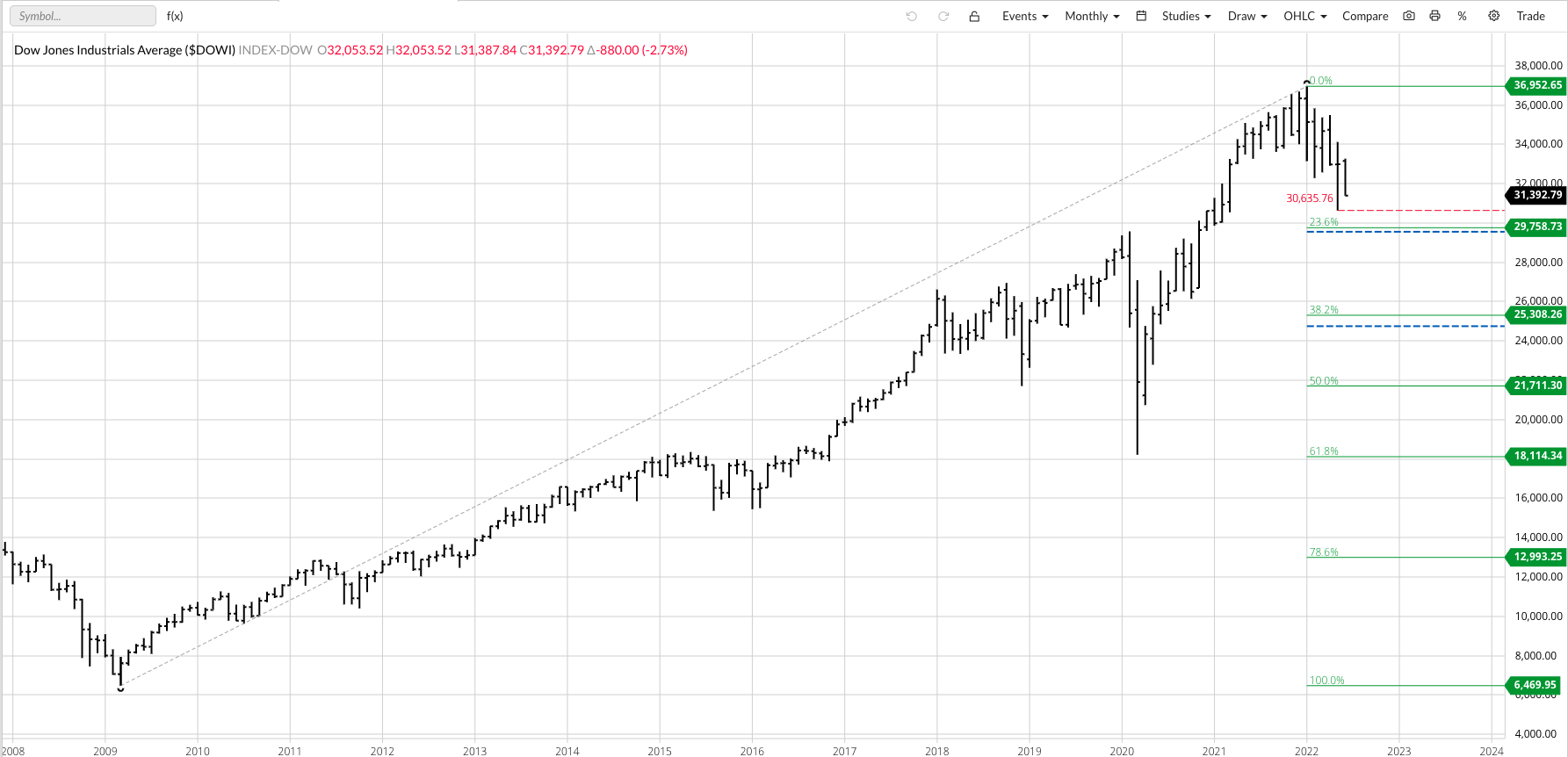As for the DJIA ($DOWI), the break has been a bit more moderate. But it is a break nonetheless with no sign of a “bottoming process” to be seen on this chart. The bearish territory of a 20% decline is down near 29,562, with the May low reaching 30,636. However, June has already seen the $DOWI hit a new 4-month low near 30,610 meaning it wouldn’t take much to reach the 20% retracement level.