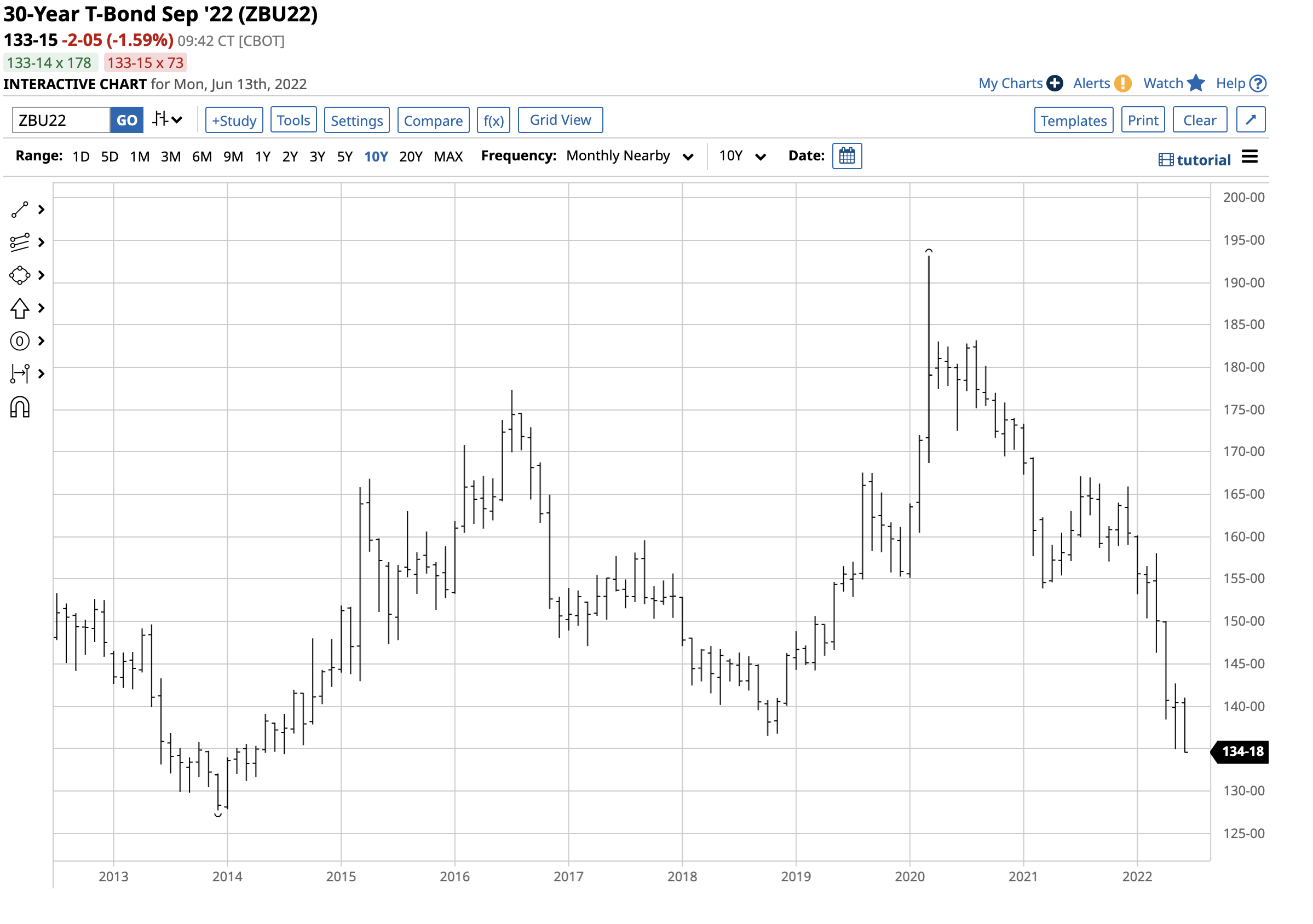 The chart of the nearby US 30-Year Treasury bond futures shows the decline to a 134-17 low on June 13, the lowest level since June 2014. At the 133-11 level on June 13, the September long bond futures contract was sitting at an eight-year low.