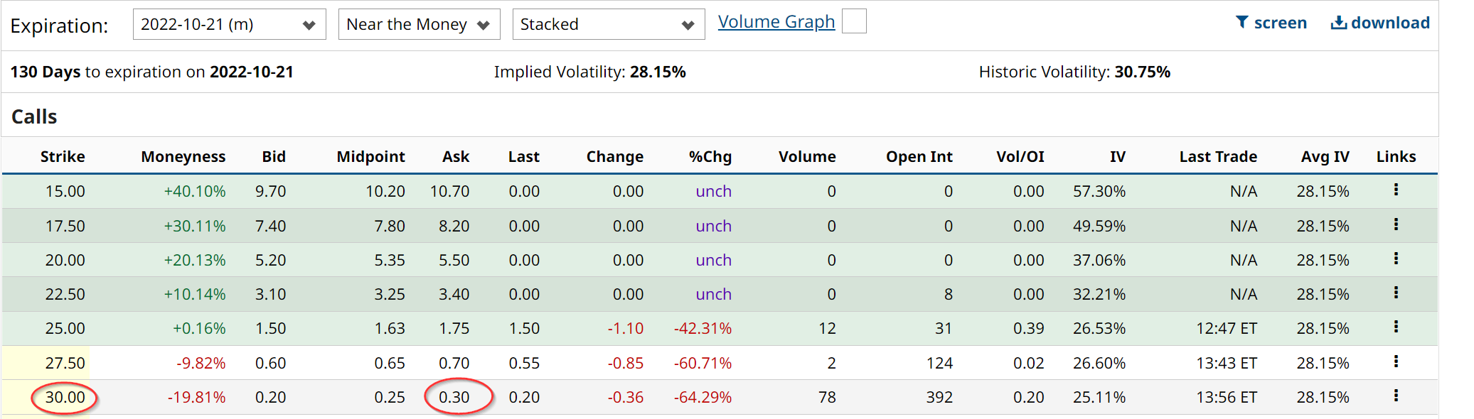 One way to create extra income is to sell out-of-the-money covered calls. For example, as the Barchart table below shows, the $30 strike price call for expiration on Oct. 21 is very attractive.