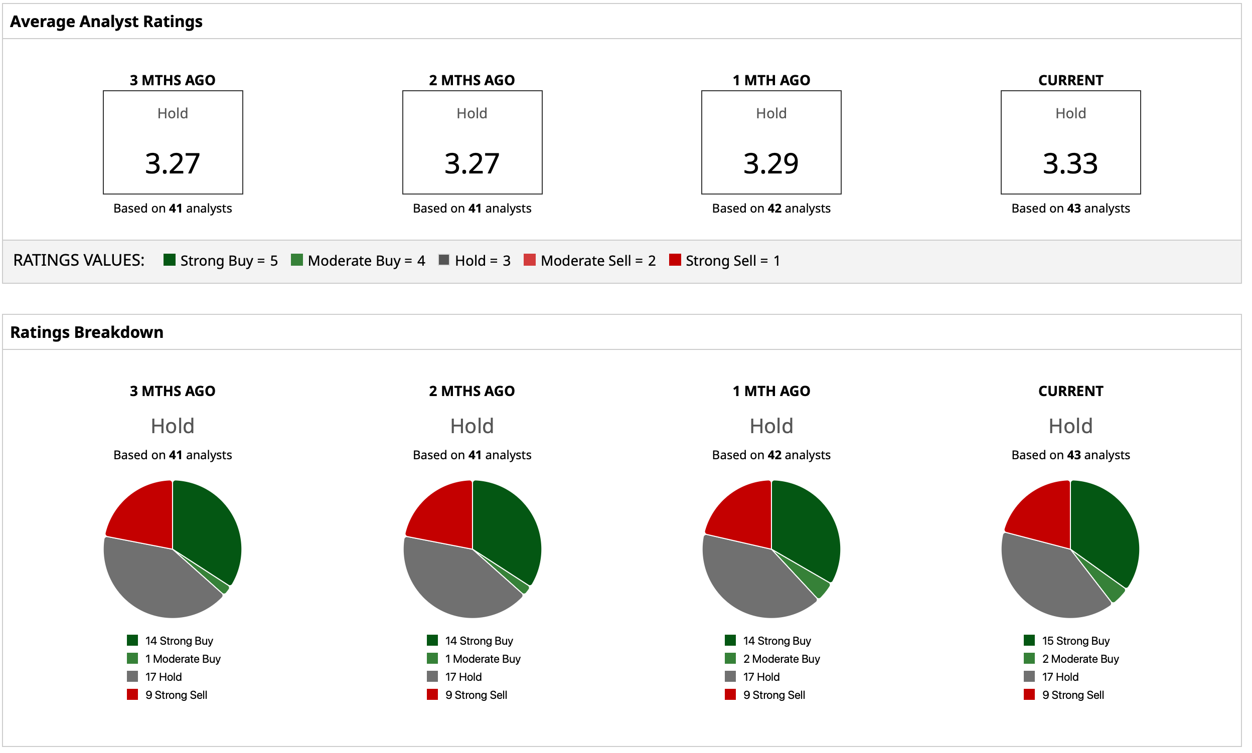 Considering this, analysts have deemed TSLA stock to be a “Hold,” with a mean target price of $408.42. This denotes an upside potential of about 9% from current levels. Out of 43 analysts covering the stock, 15 have a “Strong Buy” rating, two have a “Moderate Buy” rating, 17 have a “Hold” rating, and nine have a “Strong Sell” rating.