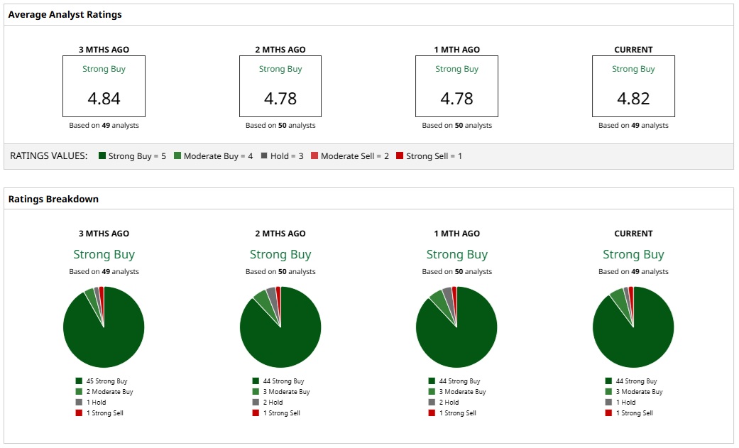 Based on 49 analysts with coverage, NVDA stock is a consensus “Strong Buy.” While 44 analysts have a “Strong Buy” rating for Nvidia, three analysts have a “Moderate Buy” rating, one analyst has a “Hold” rating, and one has a “Strong Sell” rating.
