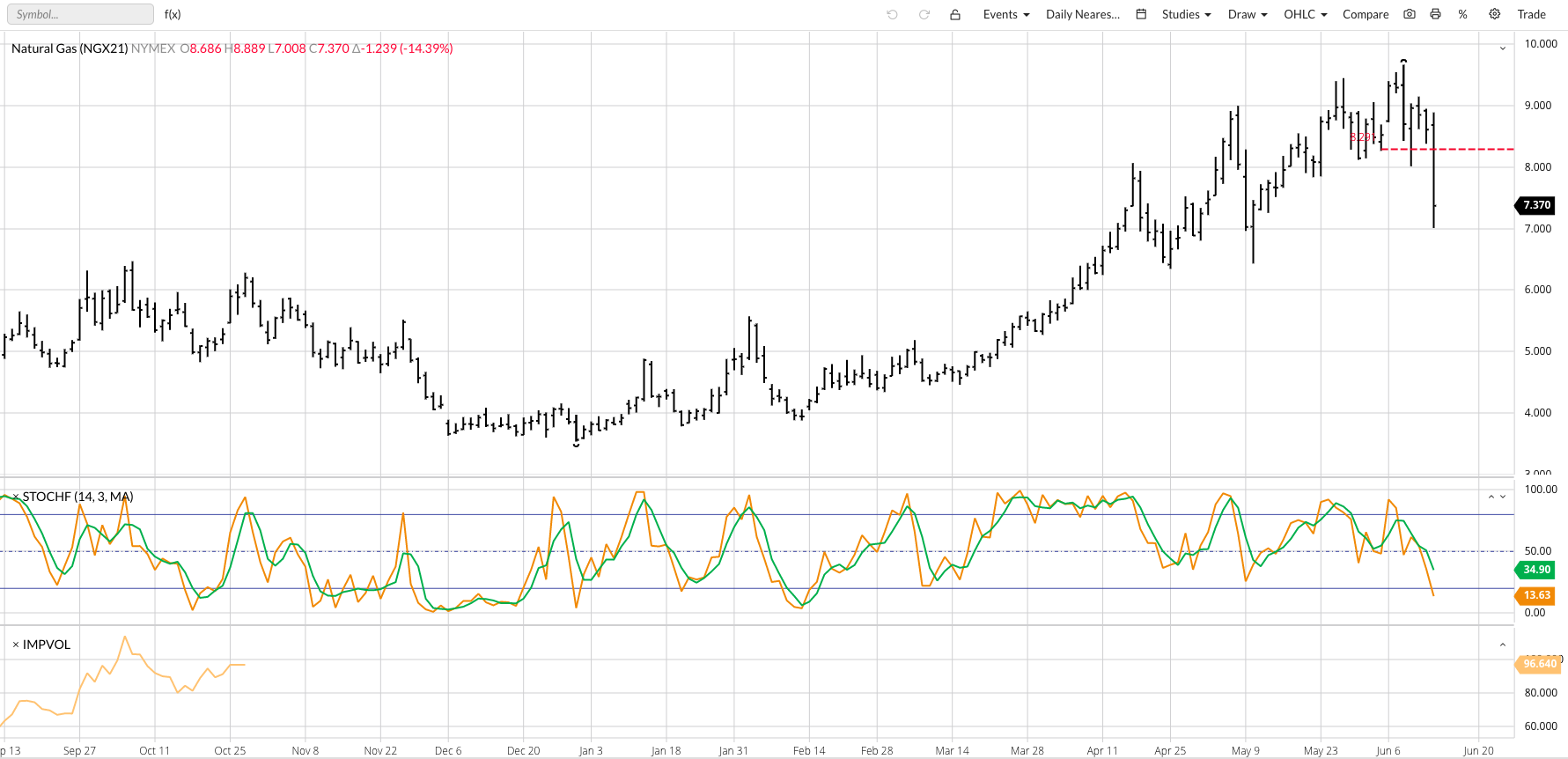 Shortly after I posted my response, a good friend sent this great question, “Speaking of throwing money down a black hole, is it worse to be tempted by natural gas or bitcoin?” My Blink response (based on the Malcolm Gladwell book “Blink”) was that it would be worse to be tempted by bitcoin. But why? It comes down to simple economics: There is nothing backing cryptocurrencies, including bitcoin (BTCUSD), meaning they have no more real value than NASS’ imaginary weekly crop condition numbers (My apologies. I said I wouldn’t mention those the rest of the season.) Since late March, bitcoin has dropped from nearly $48,000 to below $23,000 early Tuesday (June 14), a decrease of 53%.