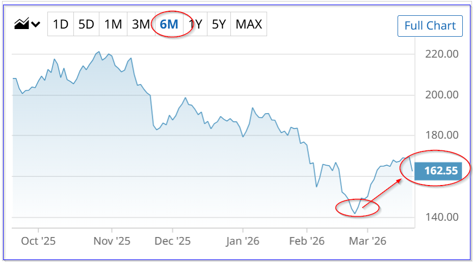 PANW is at $163.13 in midday trading on Friday, March 20. This is up from a recent trough of $141.67 on Feb. 24, after the company's fiscal Q2 earnings release on Feb. 17.
