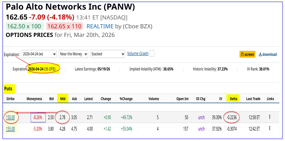 If PANW falls to $150.00 on or before April 24, the collateral will be assigned to buy 100 shares at $150.00. But the breakeven point for the investor will actually be lower: