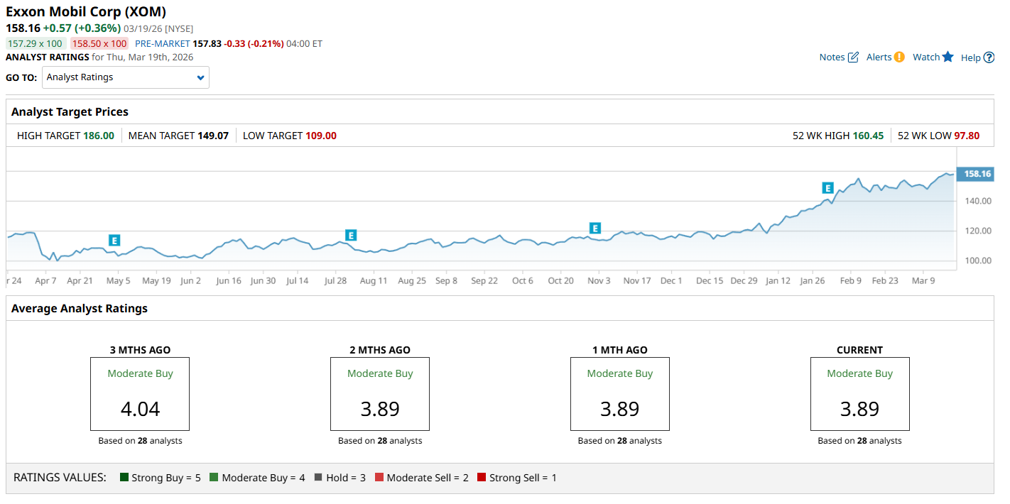 A consensus among 28 analysts rates Exxon a Moderate Buy” with an average score of 3.89 out of 5. The $186 high target price suggests up to 18% potential upside.