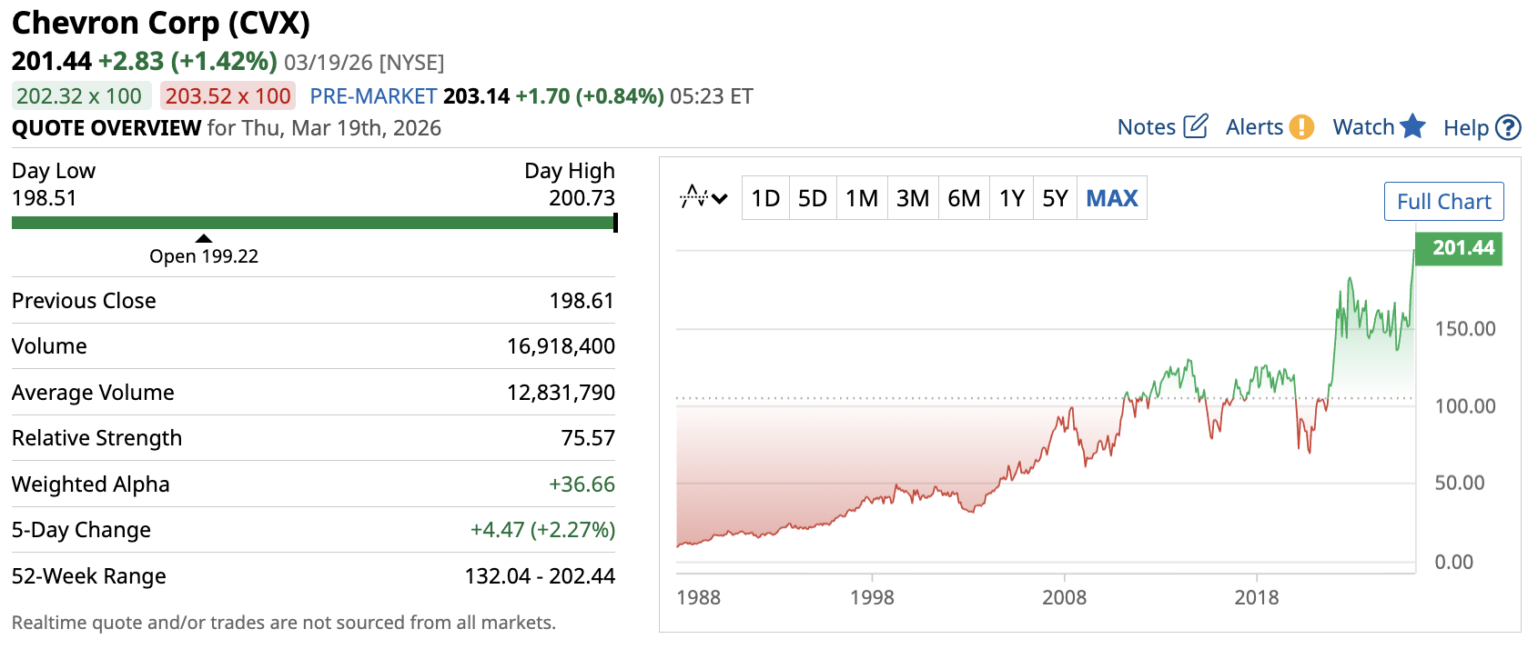 Chevron stock is trading at about $201, and it is up roughly 32% year to date.