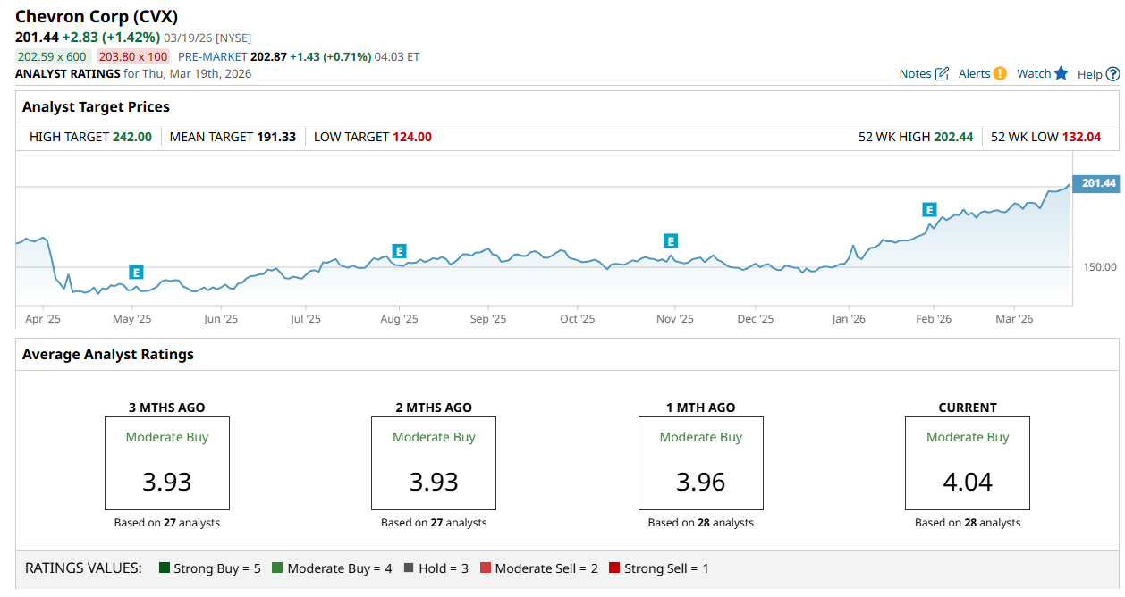 On the other hand, a consensus of the same number of analysts rates Chevron a “Moderate Buy,” with a slightly higher average score of 4.04. The high target price of $242 suggests a 20% upside potential.