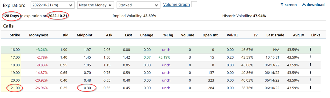 This means that after buying 100 shares at $16.39 for $1,639, investors call sell for $30 the right to buy the 100 shares of stock to someone else at $21.00 on or before Oct. 21., up to 128 days away. That extra $30 income represents an immediate return of $1.89% on the $1,639. If held to the end of the 128 days and the stock doesn't rise over $21.00 (i.e., rise by 28% over today's price), the investor keeps all of the $30 income.Â