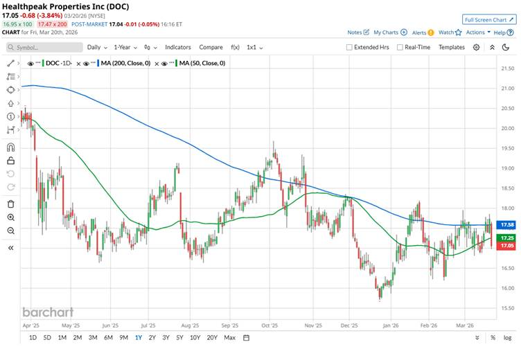 Healthpeak Properties, Inc. (DOC) is a real estate investment trust focused on owning, operating, and developing high-quality healthcare-related properties across the United States, including life sciences campuses, outpatient medical offices, and senior housing facilities. Headquartered in Denver, Colorado, the company plays a key role in supporting healthcare delivery and innovation through its diversified real estate portfolio. Healthpeak Properties has a market cap of around $11.9 billion.