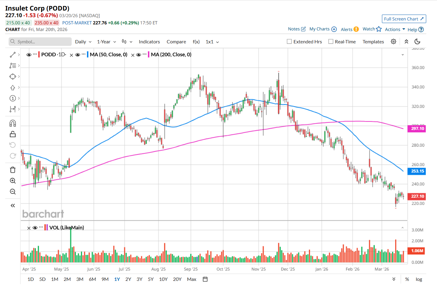 This healthcare company has dipped 36% from its 52-week high of $354.88, reached on Nov. 20, 2025. Shares of PODD have declined 21.6% over the past three months, notably underperforming the Dow Jones Industrial Average’s ($DOWI) 5.3% drop during the same time frame.