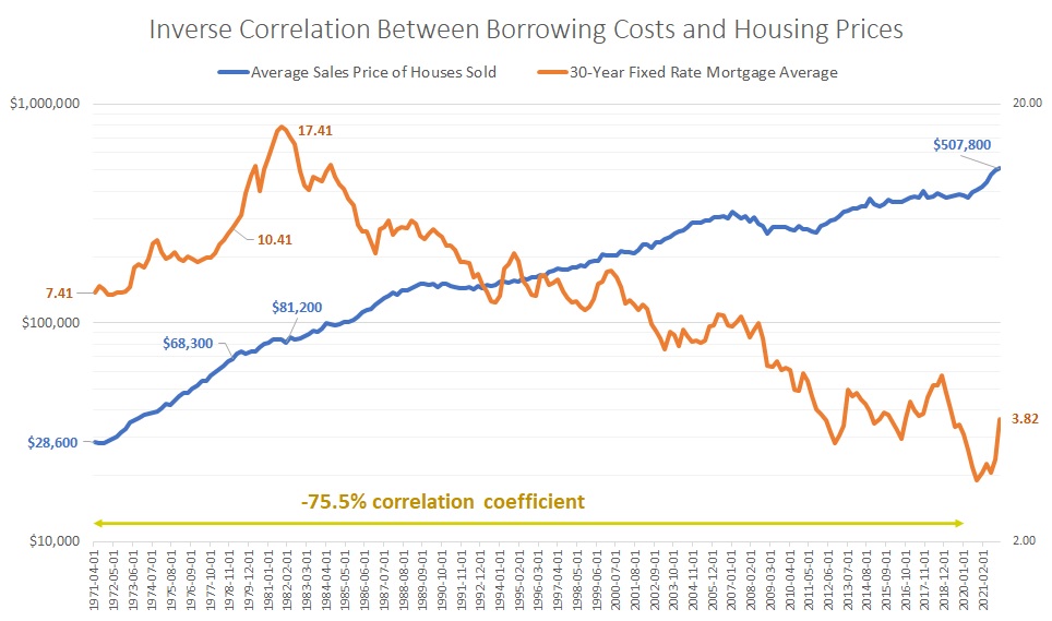 Also, do note that the direct correlation didn’t last indefinitely. When mortgage rates soared above 10%, the acceleration of housing prices clearly declined. From the early 1980s onward until the COVID-19 pandemic, the intuitive inverse relationship won out: lower rates, higher home prices.