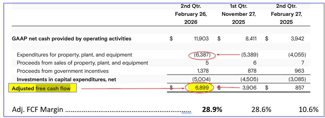 $108.77 billion rev. est. FY 2026 x 0.2875 = $31.27 billion adj. FCF