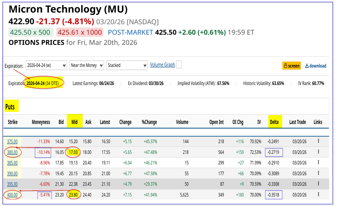 The point is that selling short out-of-the-money (OTM) MU put strike contracts is a good way to set a lower potential buy-in point.
