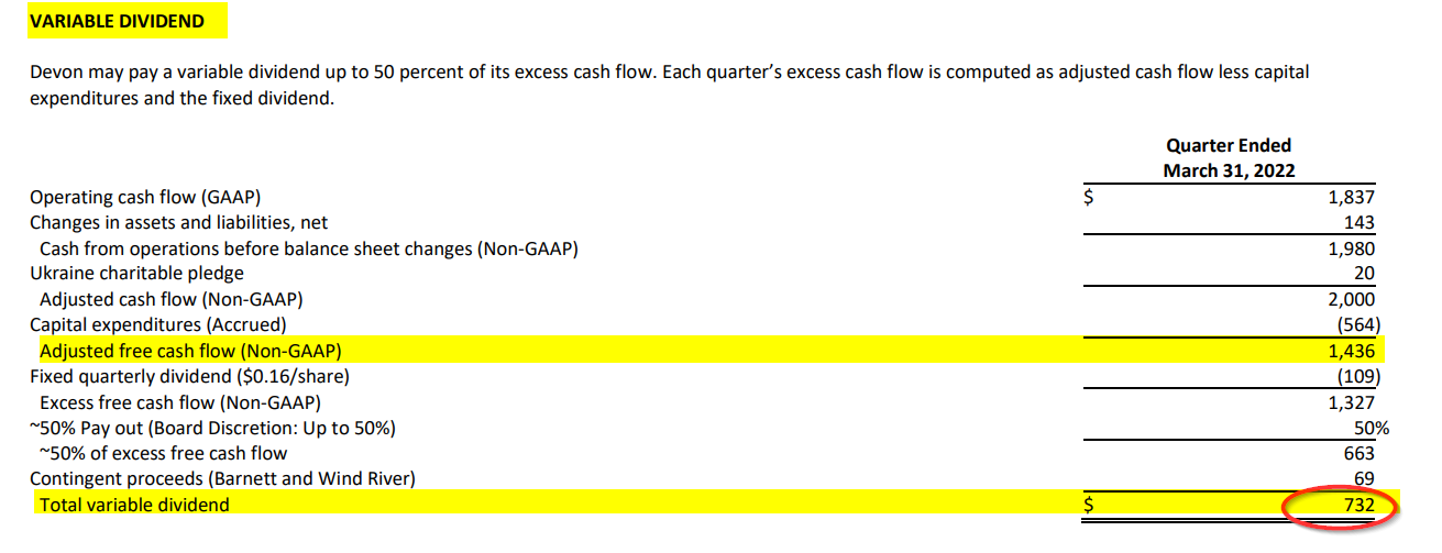 However, the variable portion of the divided changes each quarter. This is calculated as 50% of its adj. op. free cash flow. That worked out to $732 million last quarter, after deducting the 16 cents dividend or $109 million quarterly. That was also based on a very high operating cash flow marginÂ