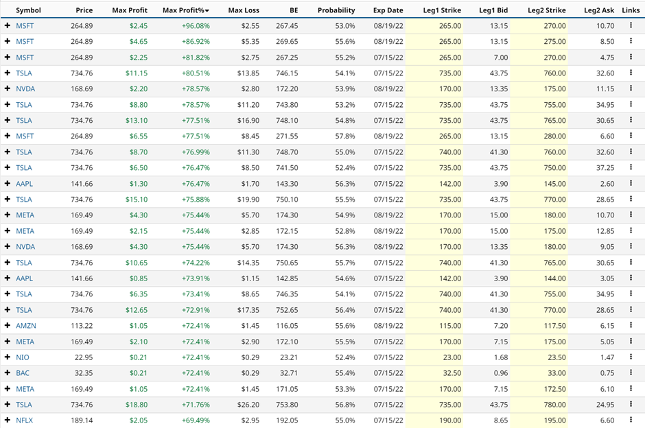 As you can see, the screener shows some interesting Bear Call Spread trades on stocks such as MSFT, TSLA, NVDA, AAPL, META, AMZN, NIO, BAC and NFLX.Â