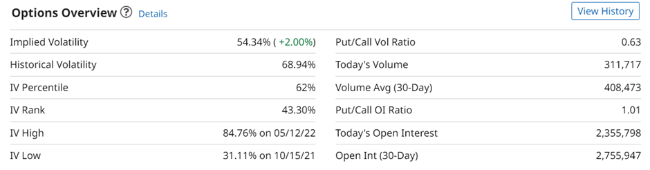 NVDA is showing an IV Percentile of 62% and an IV Rank of 43.30%. The current level of implied volatility is 54.34% compared to a 52-week high of 84.76% and a low of 31.11%.