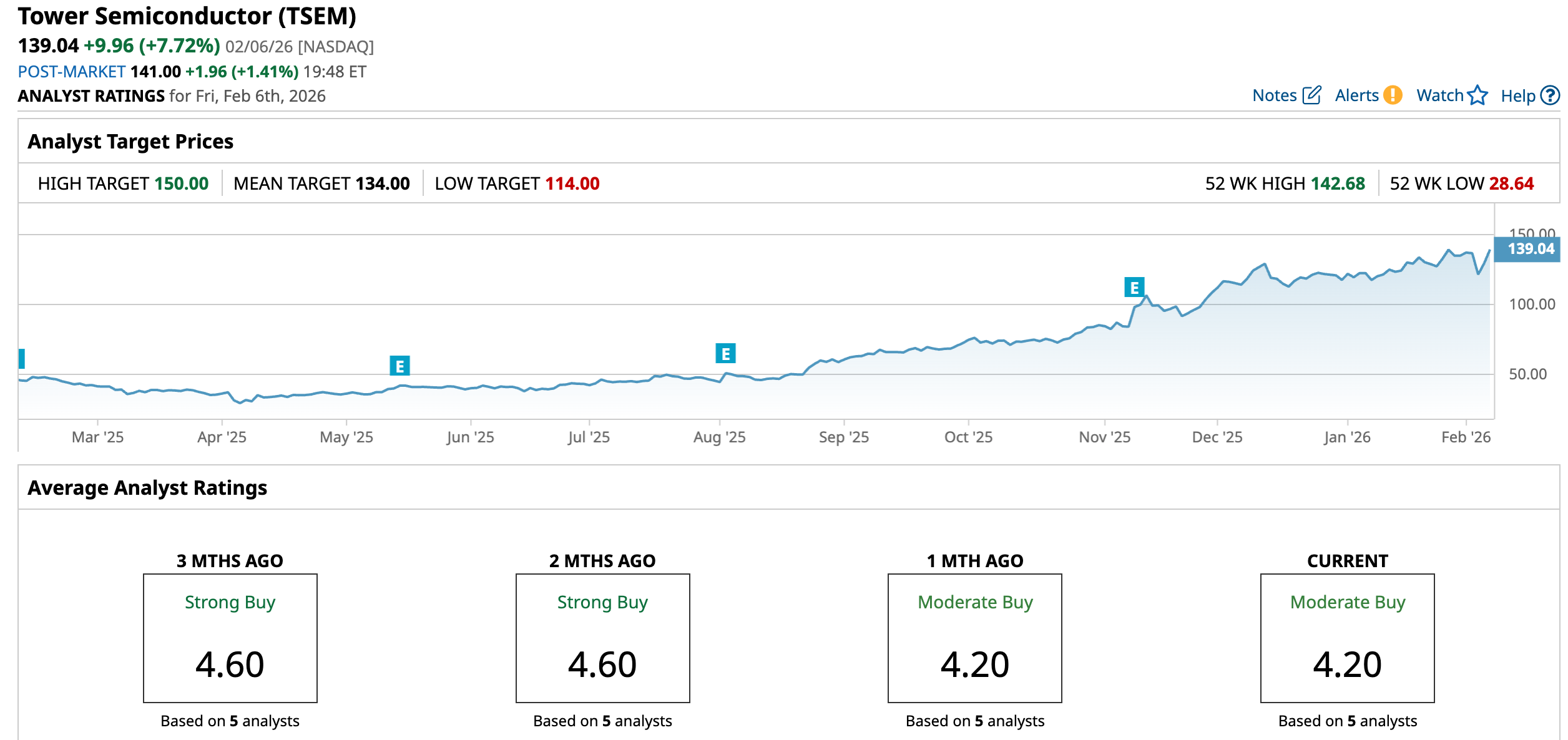 Moreover, in 2026, TSEM continued to trade near elevated levels, maintaining much of its gains. The shares recently reached a new 52-week high of around $142.68 on Feb. 3, underscoring elevated investor appetite for the company’s role in next-generation semiconductor technologies.