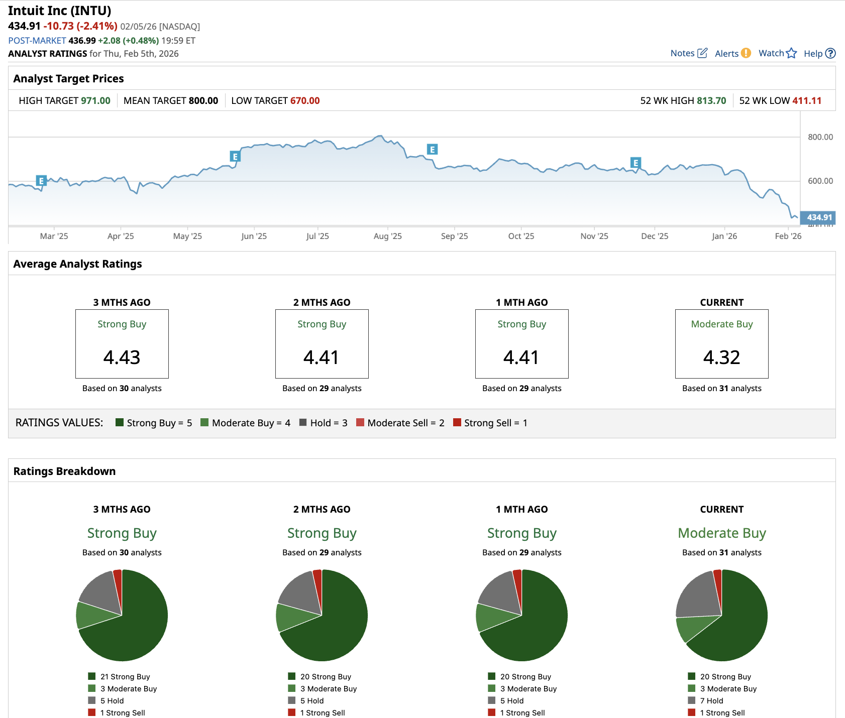 Out of the 31 analysts tracking INTU stock, 20 recommend “Strong Buy,” three recommend “Moderate Buy,” seven recommend “Hold,” and one recommends “Strong Sell.” The average INTU stock price target is $800, above the current price of about $435.