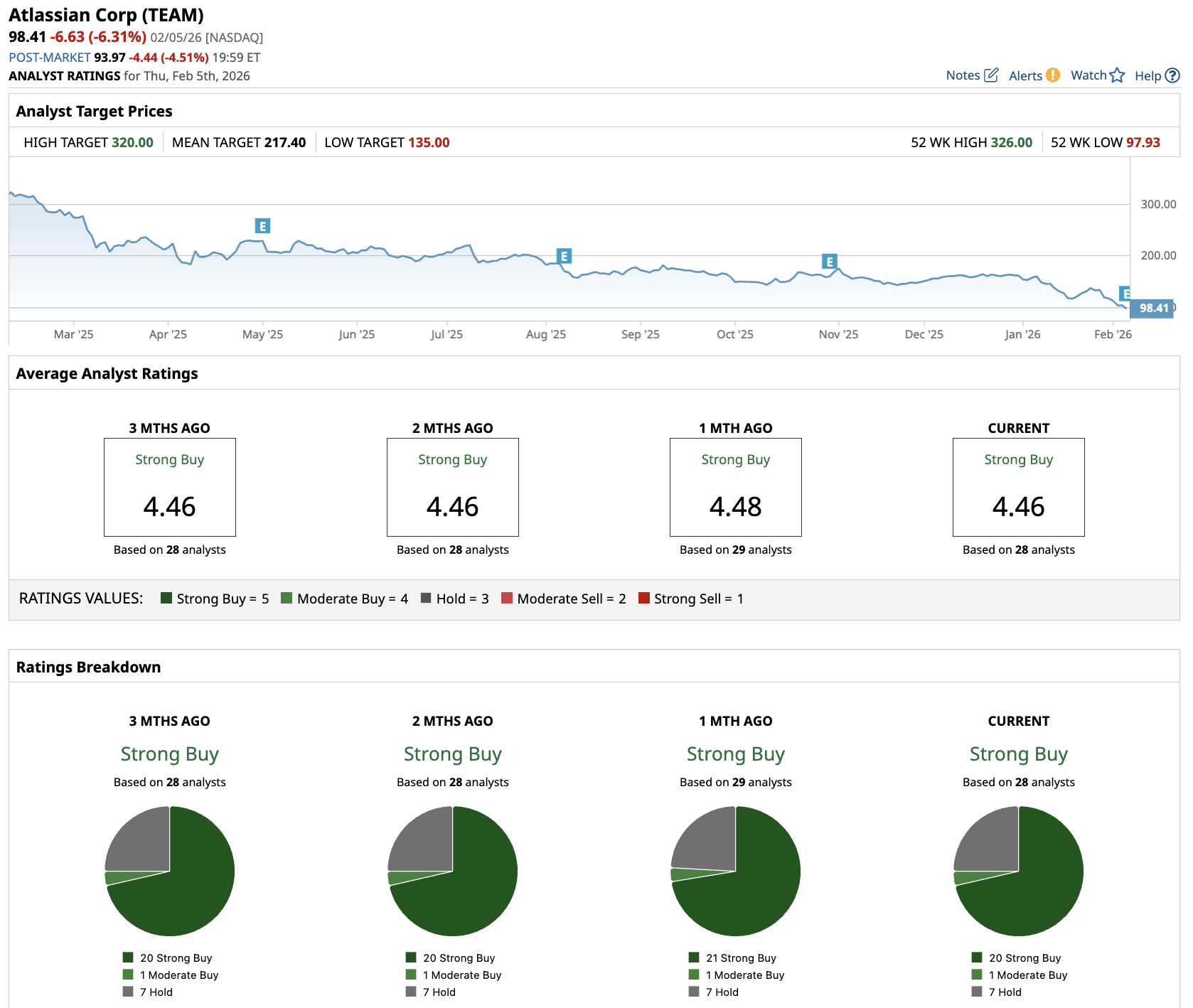 Out of the 28 analysts tracking TEAM stock, 20 recommend “Strong Buy,” one recommends “Moderate Buy,” and seven recommend “Hold.” The average TEAM stock price target is $217.40, above the current price of about $98.