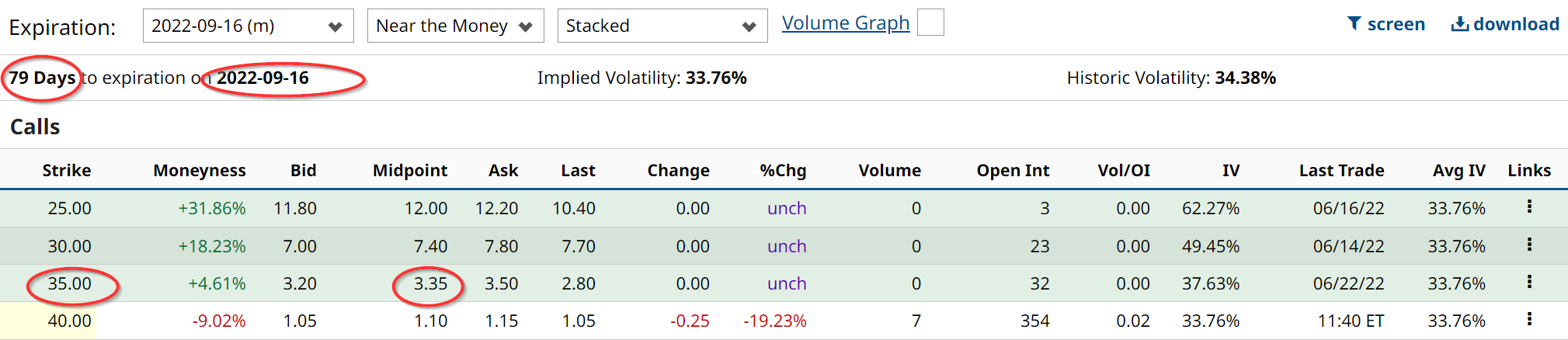 This shows that the Sept. 16 calls at $35 will cost $3.35 in the mid-point, so the all-in cost if held till expiration and exercised, will be $38.35. That is just 1.04% over today's price of $36.85, but provides 11x leverage to the investor. This is because the stock price of $36.85 is exactly 11 times the option premium cost of $3.35.
